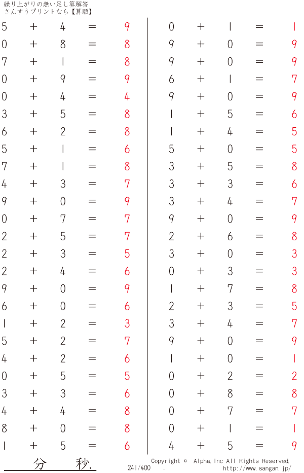 上記のボタンから「繰り上がりの無い足し算」の算数数学ドリル・計算ドリル(PDFプリント)がダウンロードできます。個人利用は無料です(家庭以外での配布は有料です)。