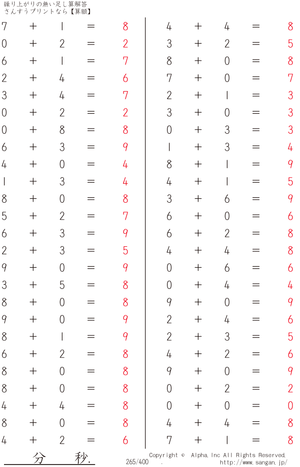 上記のボタンから「繰り上がりの無い足し算」の算数数学ドリル・計算ドリル(PDFプリント)がダウンロードできます。個人利用は無料です(家庭以外での配布は有料です)。