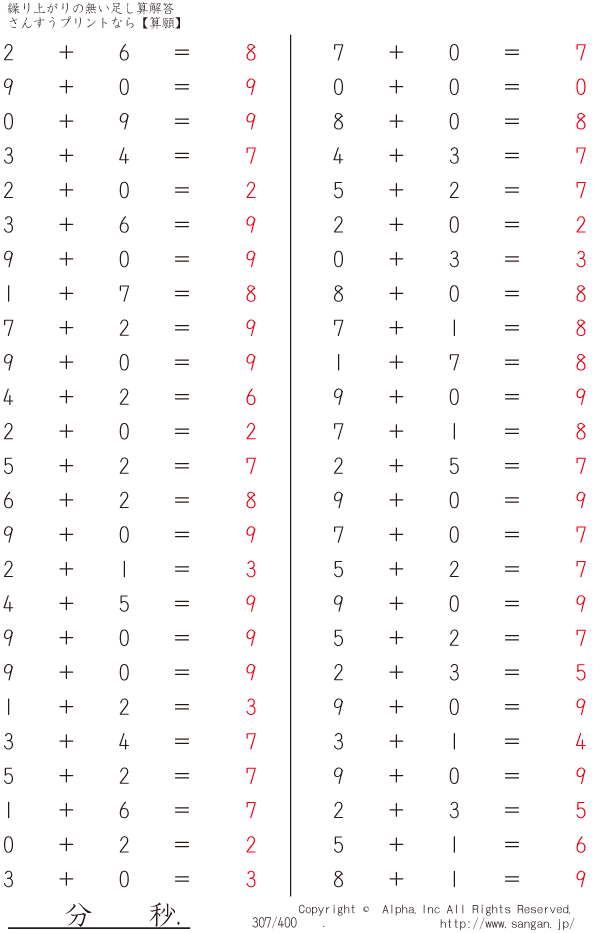 上記のボタンから「繰り上がりの無い足し算」の算数数学ドリル・計算ドリル(PDFプリント)がダウンロードできます。個人利用は無料です(家庭以外での配布は有料です)。