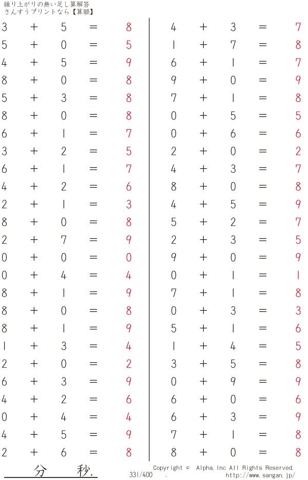 上記のボタンから「繰り上がりの無い足し算」の算数数学ドリル・計算ドリル(PDFプリント)がダウンロードできます。個人利用は無料です(家庭以外での配布は有料です)。