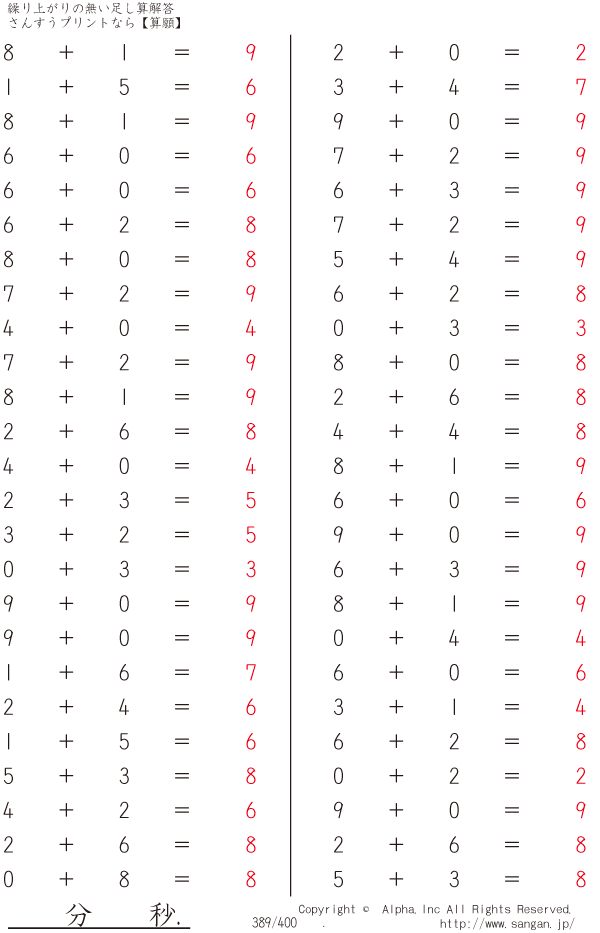 上記のボタンから「繰り上がりの無い足し算」の算数数学ドリル・計算ドリル(PDFプリント)がダウンロードできます。個人利用は無料です(家庭以外での配布は有料です)。