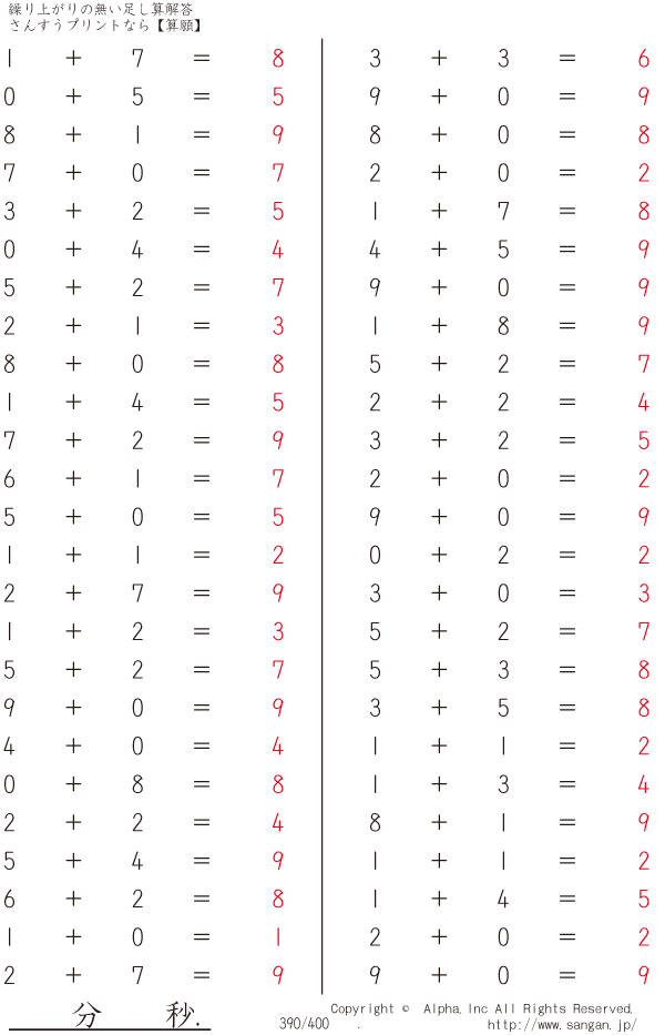 上記のボタンから「繰り上がりの無い足し算」の算数数学ドリル・計算ドリル(PDFプリント)がダウンロードできます。個人利用は無料です(家庭以外での配布は有料です)。