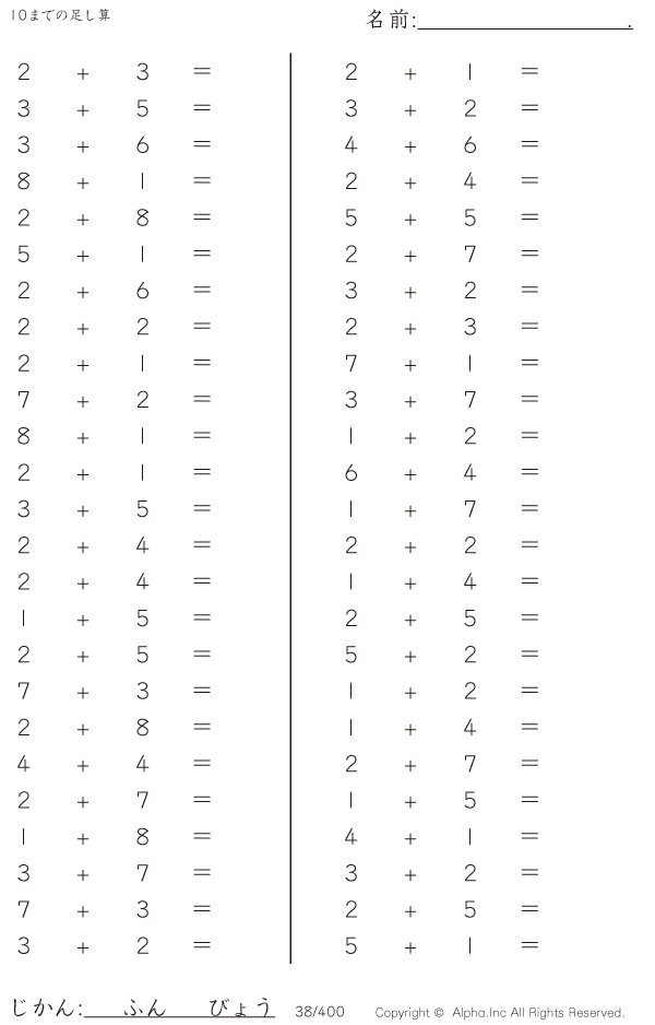 上記のボタンから「10までの足し算」の算数数学ドリル・計算ドリル(PDFプリント)がダウンロードできます。個人利用は無料です(家庭以外での配布は有料です)。