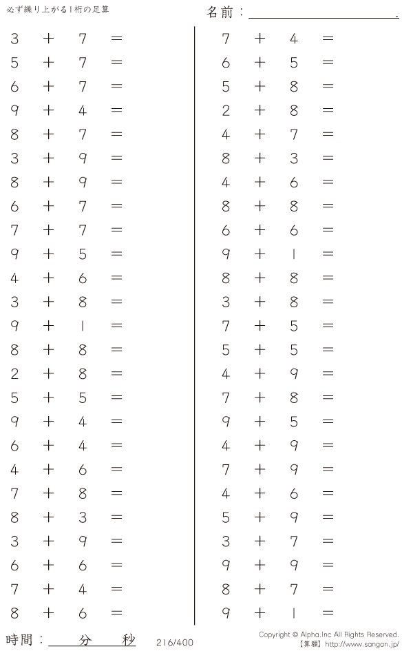 上記のボタンから「必ず繰り上がる1桁の足算」の算数数学ドリル・計算ドリル(PDFプリント)がダウンロードできます。個人利用は無料です(家庭以外での配布は有料です)。