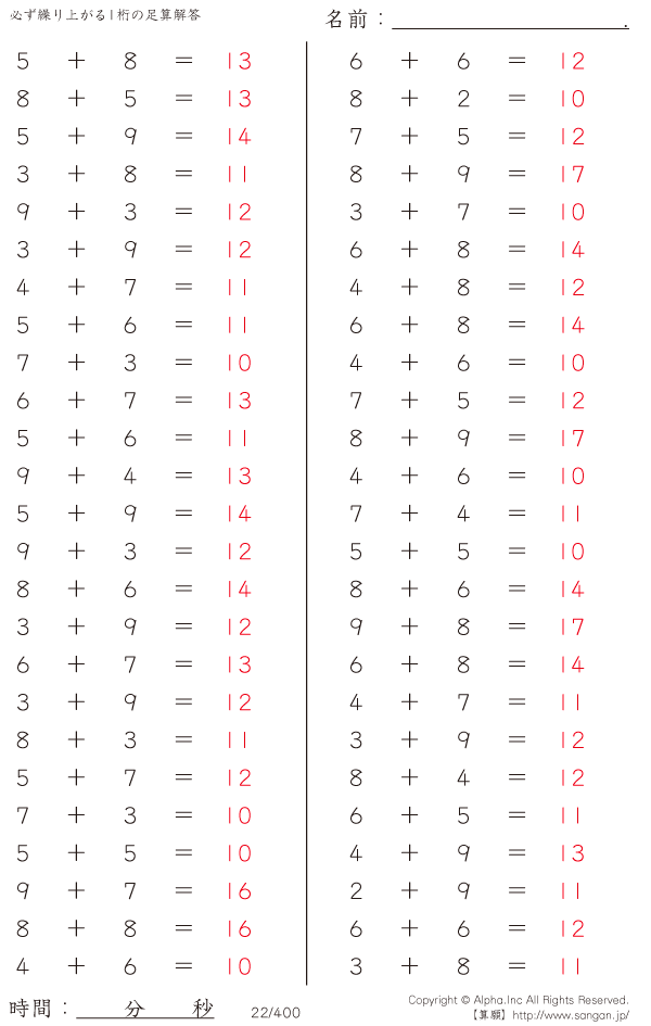 必ず繰り上がる1桁の足算 [解答]022/400
