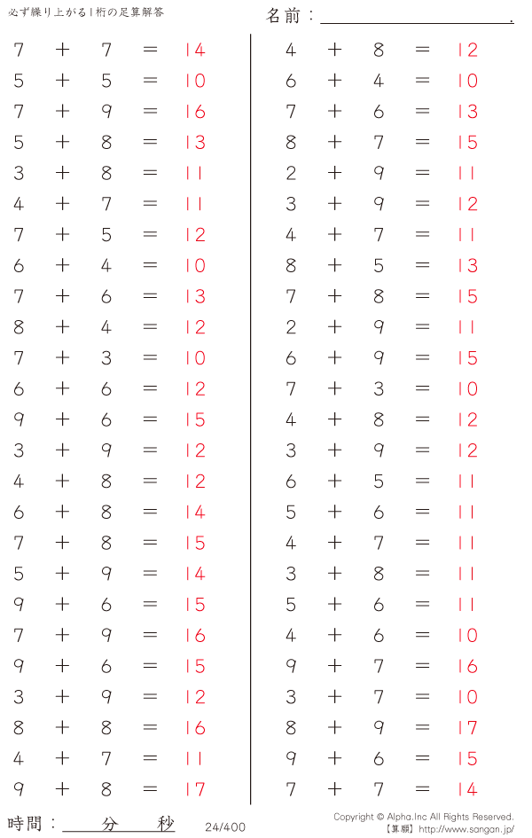 上記のボタンから「必ず繰り上がる1桁の足算」の算数数学ドリル・計算ドリル(PDFプリント)がダウンロードできます。個人利用は無料です(家庭以外での配布は有料です)。
