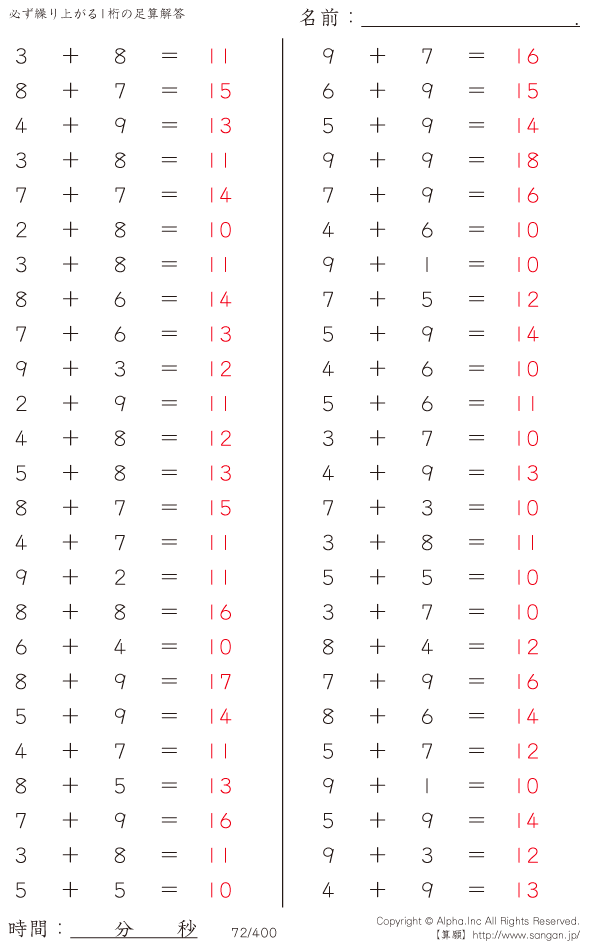 上記のボタンから「必ず繰り上がる1桁の足算」の算数数学ドリル・計算ドリル(PDFプリント)がダウンロードできます。個人利用は無料です(家庭以外での配布は有料です)。