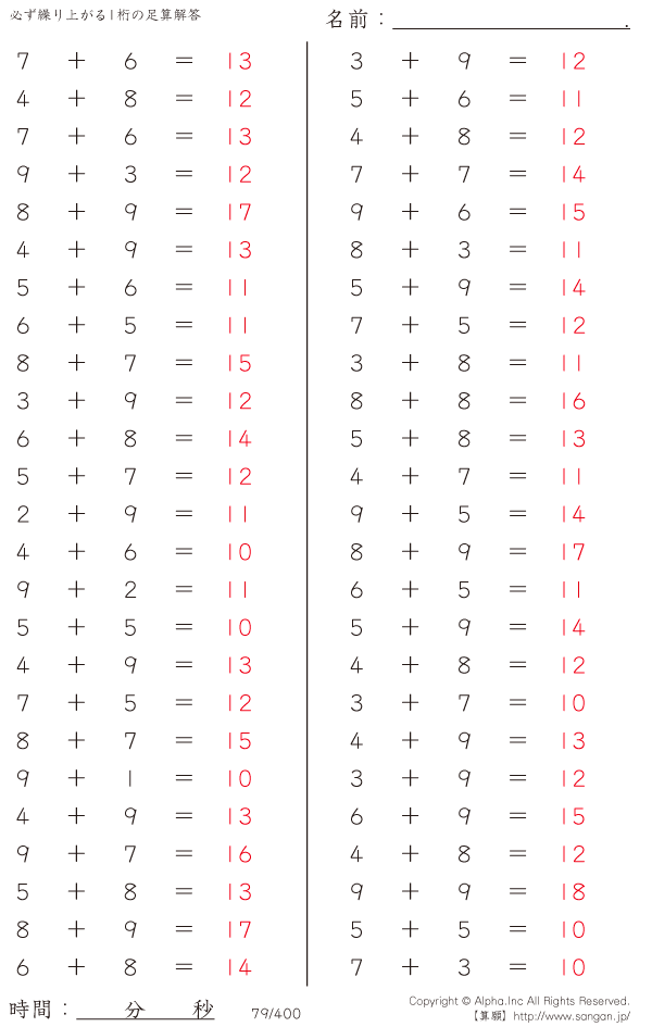 上記のボタンから「必ず繰り上がる1桁の足算」の算数数学ドリル・計算ドリル(PDFプリント)がダウンロードできます。個人利用は無料です(家庭以外での配布は有料です)。