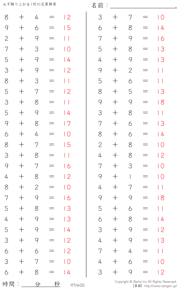 上記のボタンから「必ず繰り上がる1桁の足算」の算数数学ドリル・計算ドリル(PDFプリント)がダウンロードできます。個人利用は無料です(家庭以外での配布は有料です)。