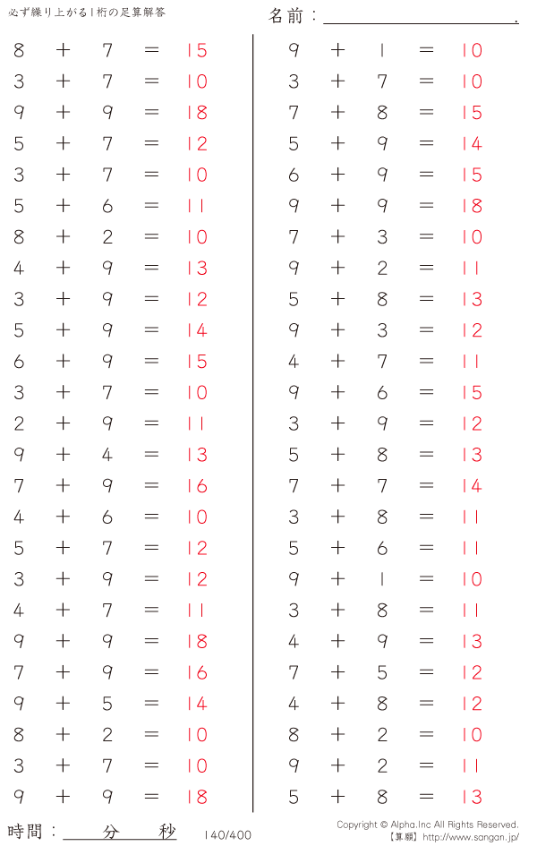 上記のボタンから「必ず繰り上がる1桁の足算」の算数数学ドリル・計算ドリル(PDFプリント)がダウンロードできます。個人利用は無料です(家庭以外での配布は有料です)。