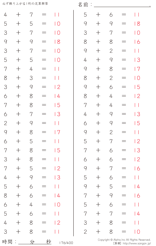 必ず繰り上がる1桁の足算 [解答]176/400