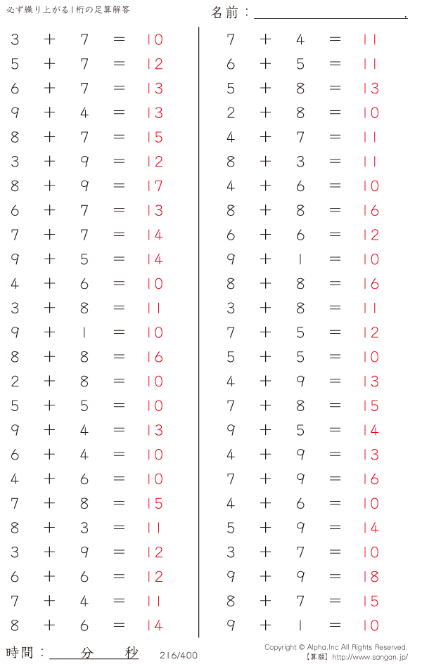 上記のボタンから「必ず繰り上がる1桁の足算」の算数数学ドリル・計算ドリル(PDFプリント)がダウンロードできます。個人利用は無料です(家庭以外での配布は有料です)。