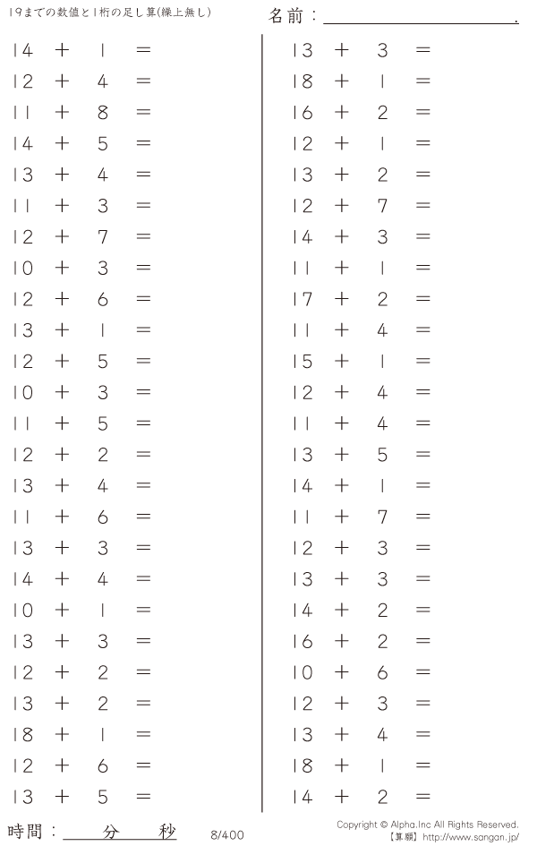 19までの数値と1桁の足し算(繰上無し) [問題]008/400