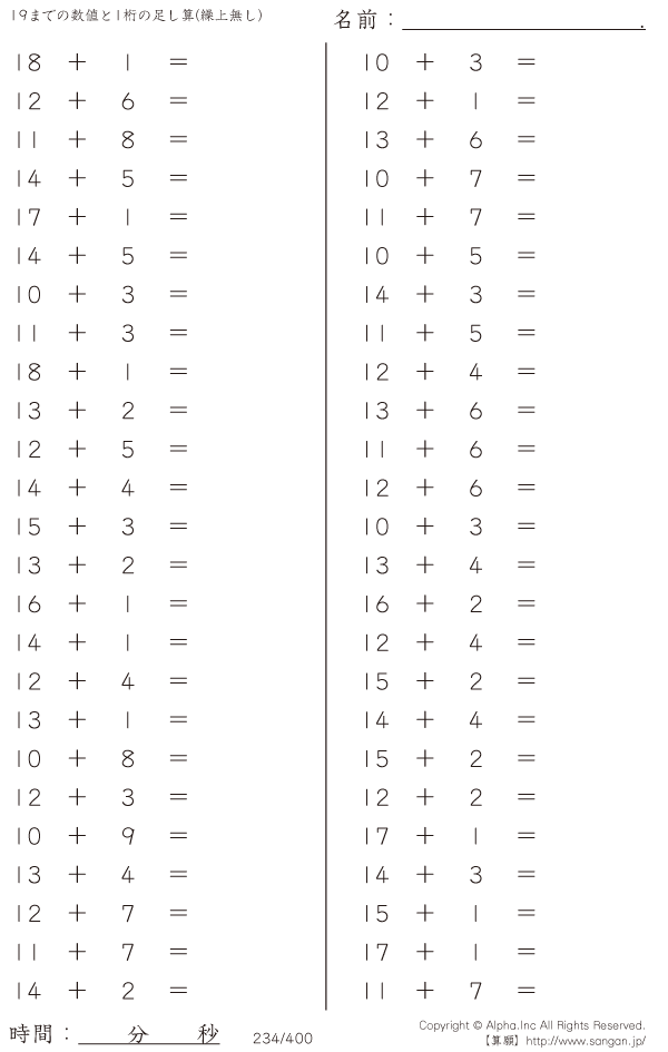19までの数値と1桁の足し算(繰上無し) [問題]234/400