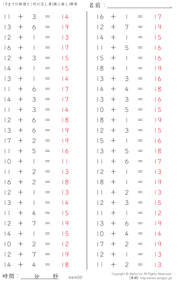 19までの数値と1桁の足し算(繰上無し) [解答]044/400