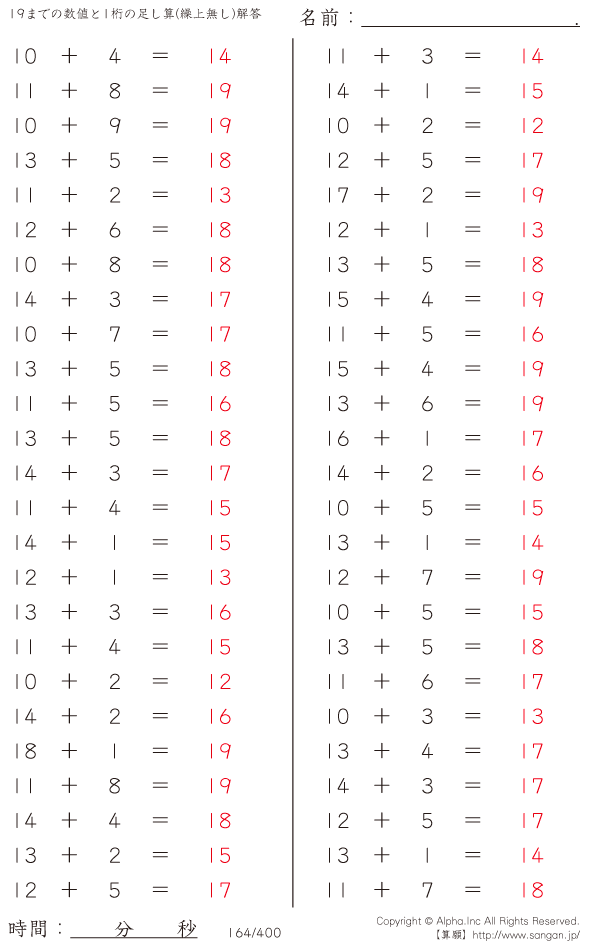 19までの数値と1桁の足し算(繰上無し) [解答]164/400