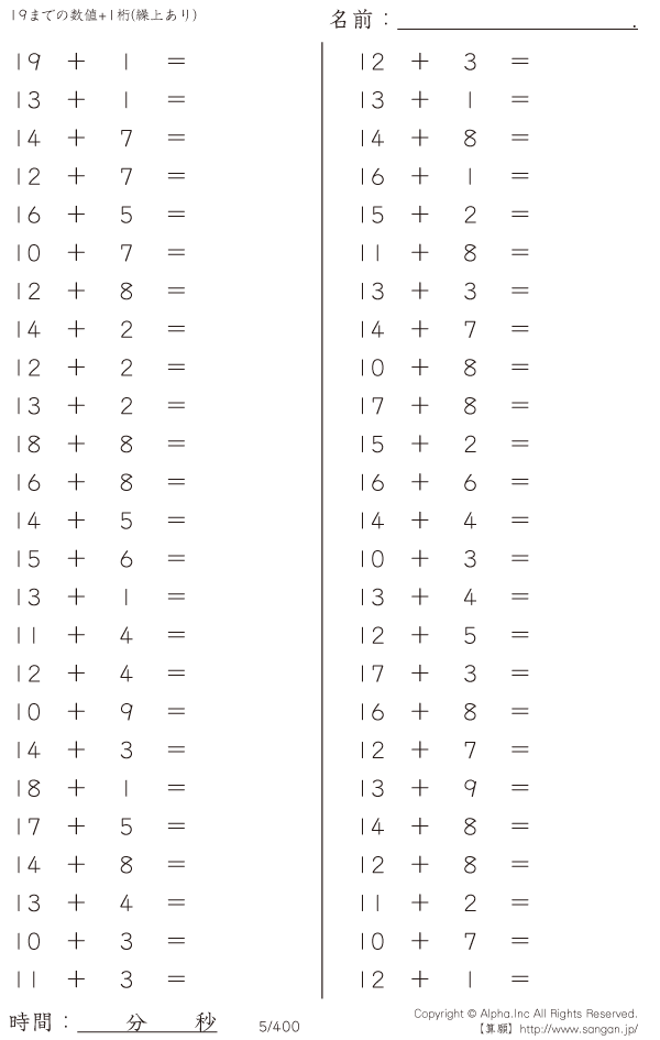 19までの数値と1桁の足し算(繰上あり) [問題]005/400