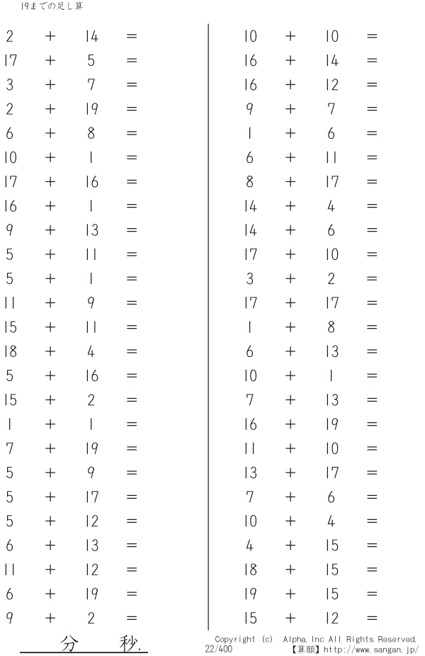 上記のボタンから「19までの足し算」の算数数学ドリル・計算ドリル(PDFプリント)がダウンロードできます。個人利用は無料です(家庭以外での配布は有料です)。
