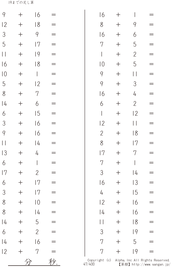 上記のボタンから「19までの足し算」の算数数学ドリル・計算ドリル(PDFプリント)がダウンロードできます。個人利用は無料です(家庭以外での配布は有料です)。