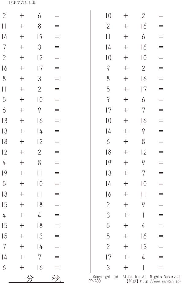上記のボタンから「19までの足し算」の算数数学ドリル・計算ドリル(PDFプリント)がダウンロードできます。個人利用は無料です(家庭以外での配布は有料です)。
