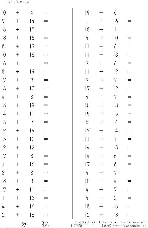 上記のボタンから「19までの足し算」の算数数学ドリル・計算ドリル(PDFプリント)がダウンロードできます。個人利用は無料です(家庭以外での配布は有料です)。