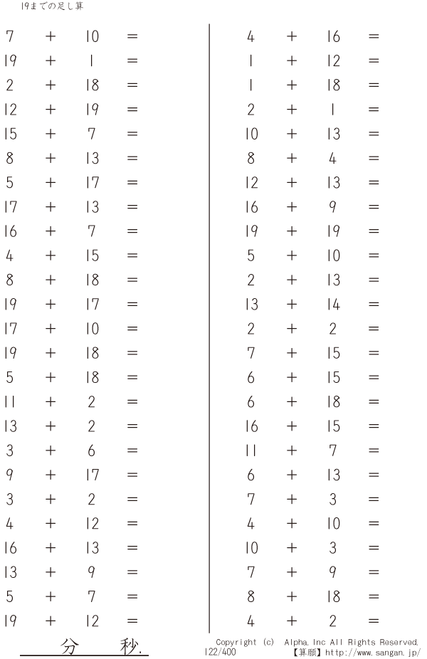 上記のボタンから「19までの足し算」の算数数学ドリル・計算ドリル(PDFプリント)がダウンロードできます。個人利用は無料です(家庭以外での配布は有料です)。