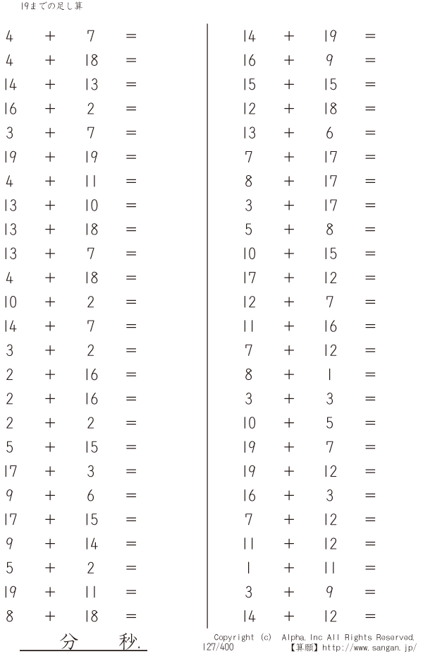 上記のボタンから「19までの足し算」の算数数学ドリル・計算ドリル(PDFプリント)がダウンロードできます。個人利用は無料です(家庭以外での配布は有料です)。