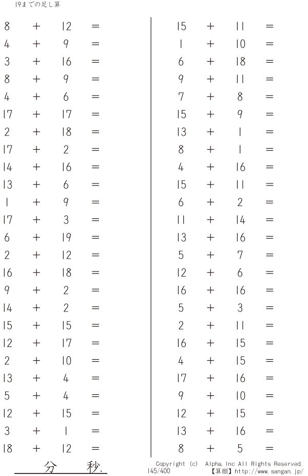 上記のボタンから「19までの足し算」の算数数学ドリル・計算ドリル(PDFプリント)がダウンロードできます。個人利用は無料です(家庭以外での配布は有料です)。