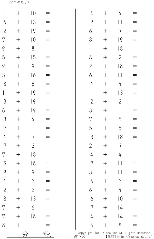 上記のボタンから「19までの足し算」の算数数学ドリル・計算ドリル(PDFプリント)がダウンロードできます。個人利用は無料です(家庭以外での配布は有料です)。