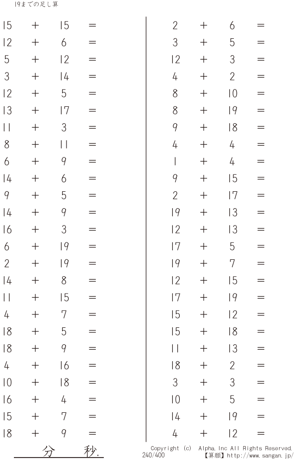 上記のボタンから「19までの足し算」の算数数学ドリル・計算ドリル(PDFプリント)がダウンロードできます。個人利用は無料です(家庭以外での配布は有料です)。
