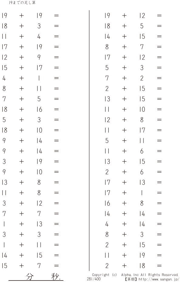 上記のボタンから「19までの足し算」の算数数学ドリル・計算ドリル(PDFプリント)がダウンロードできます。個人利用は無料です(家庭以外での配布は有料です)。