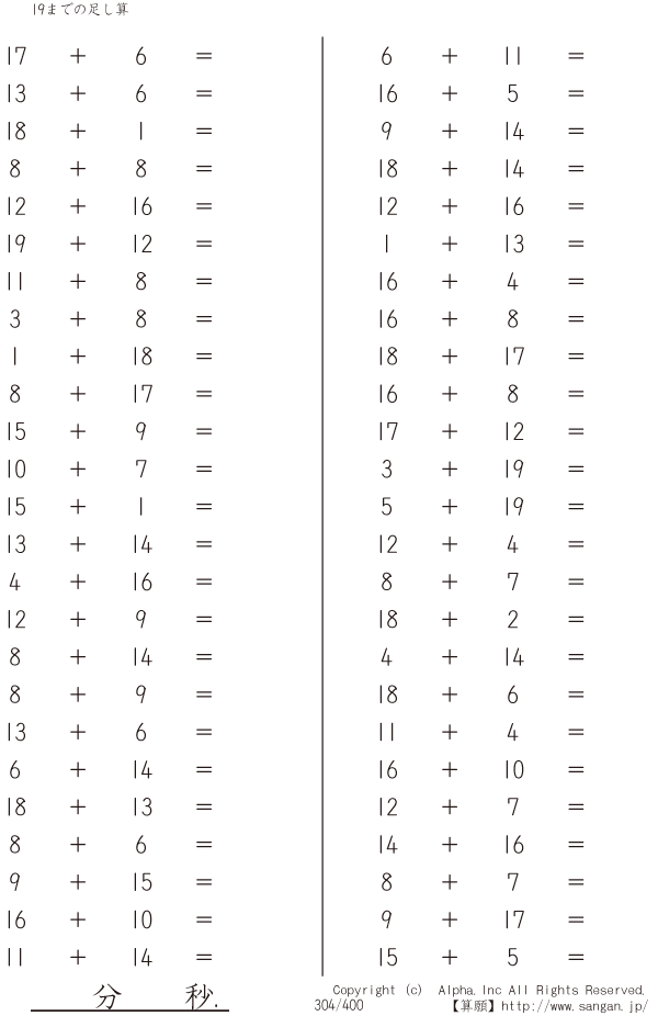 上記のボタンから「19までの足し算」の算数数学ドリル・計算ドリル(PDFプリント)がダウンロードできます。個人利用は無料です(家庭以外での配布は有料です)。