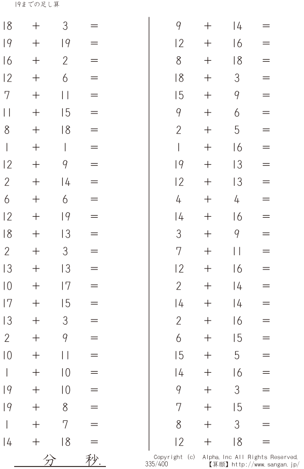 上記のボタンから「19までの足し算」の算数数学ドリル・計算ドリル(PDFプリント)がダウンロードできます。個人利用は無料です(家庭以外での配布は有料です)。