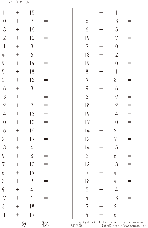 上記のボタンから「19までの足し算」の算数数学ドリル・計算ドリル(PDFプリント)がダウンロードできます。個人利用は無料です(家庭以外での配布は有料です)。
