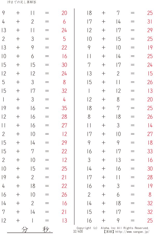 上記のボタンから「19までの足し算」の算数数学ドリル・計算ドリル(PDFプリント)がダウンロードできます。個人利用は無料です(家庭以外での配布は有料です)。