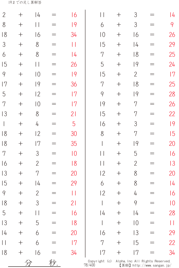 上記のボタンから「19までの足し算」の算数数学ドリル・計算ドリル(PDFプリント)がダウンロードできます。個人利用は無料です(家庭以外での配布は有料です)。
