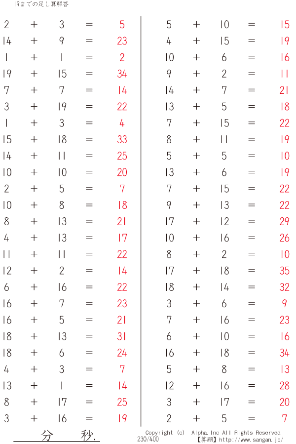 上記のボタンから「19までの足し算」の算数数学ドリル・計算ドリル(PDFプリント)がダウンロードできます。個人利用は無料です(家庭以外での配布は有料です)。