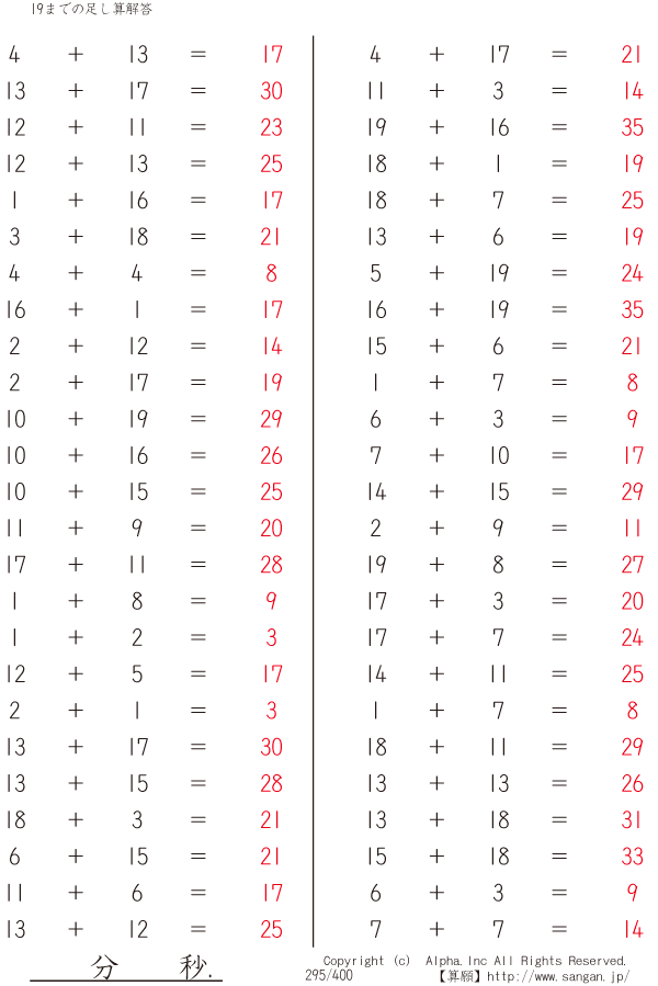 上記のボタンから「19までの足し算」の算数数学ドリル・計算ドリル(PDFプリント)がダウンロードできます。個人利用は無料です(家庭以外での配布は有料です)。