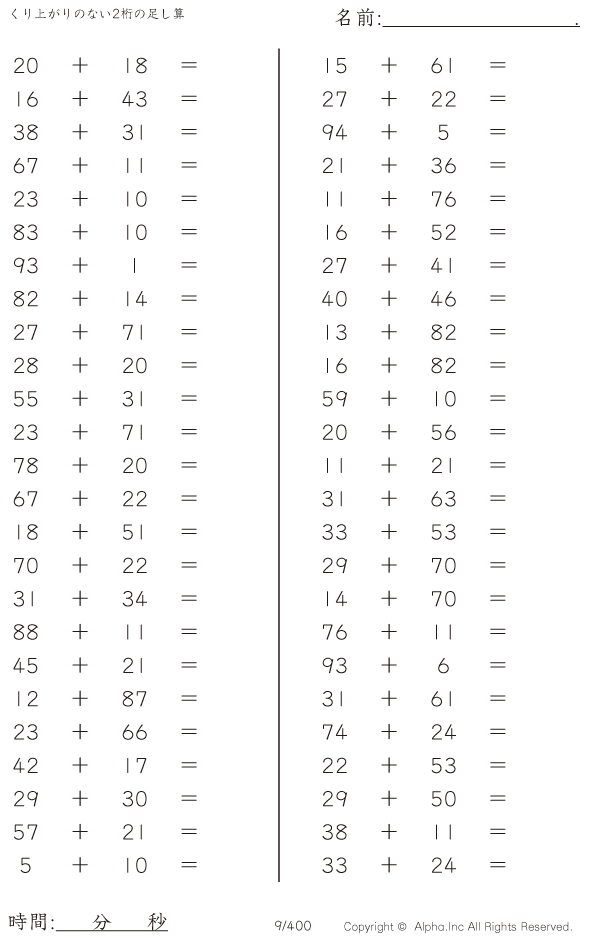 上記のボタンから「くり上がりのない2桁の足し算」の算数数学ドリル・計算ドリル(PDFプリント)がダウンロードできます。個人利用は無料です(家庭以外での配布は有料です)。