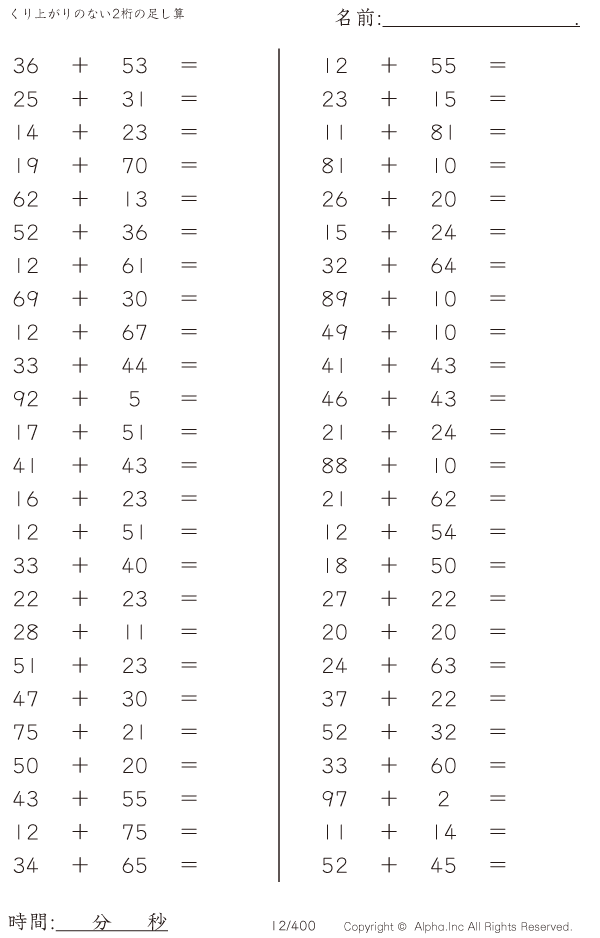 上記のボタンから「くり上がりのない2桁の足し算」の算数数学ドリル・計算ドリル(PDFプリント)がダウンロードできます。個人利用は無料です(家庭以外での配布は有料です)。
