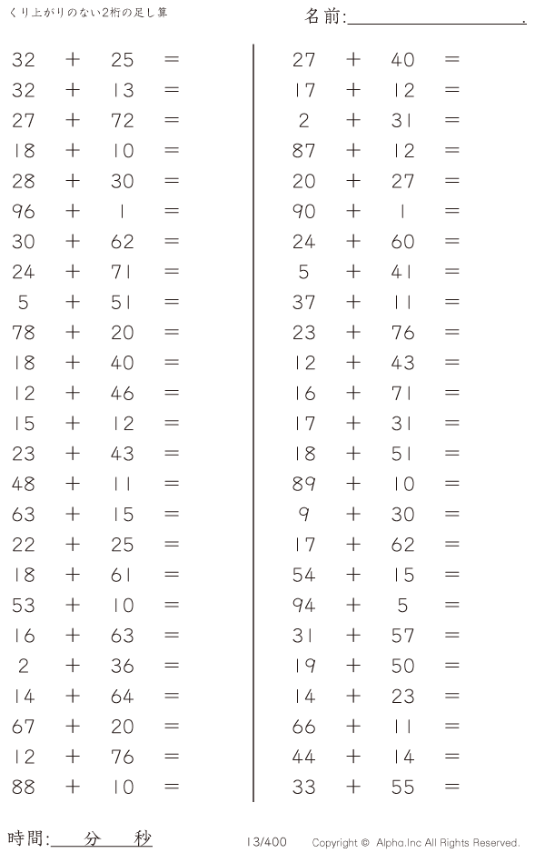 上記のボタンから「くり上がりのない2桁の足し算」の算数数学ドリル・計算ドリル(PDFプリント)がダウンロードできます。個人利用は無料です(家庭以外での配布は有料です)。
