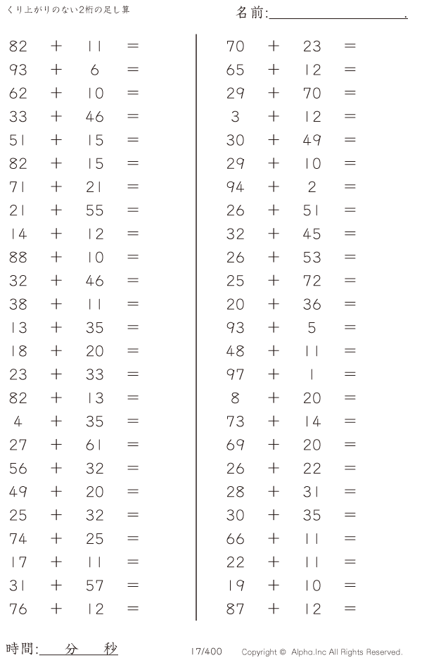 上記のボタンから「くり上がりのない2桁の足し算」の算数数学ドリル・計算ドリル(PDFプリント)がダウンロードできます。個人利用は無料です(家庭以外での配布は有料です)。