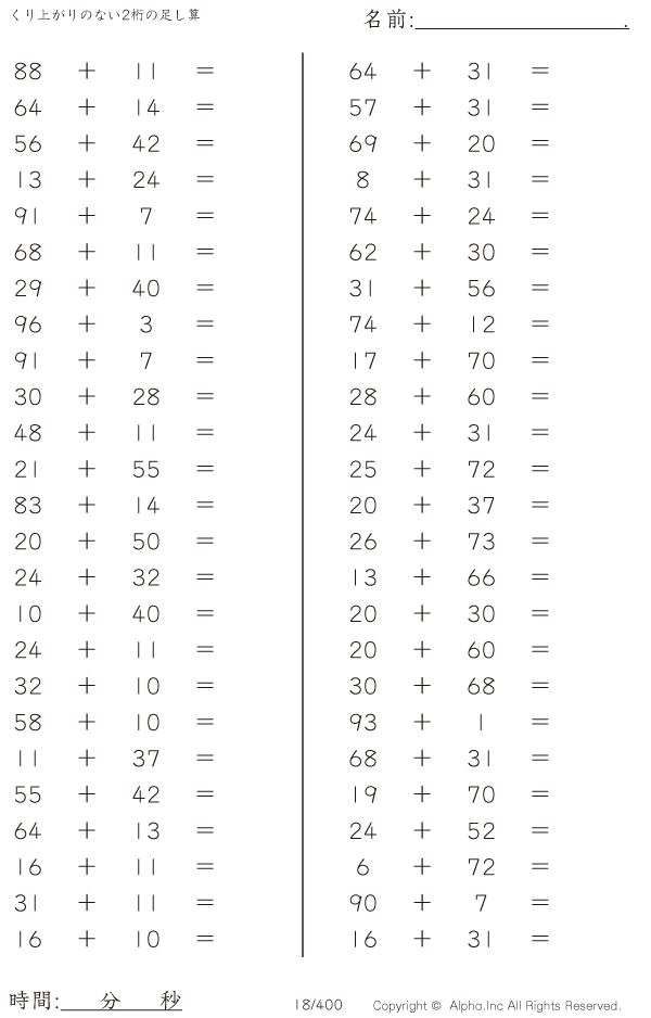 上記のボタンから「くり上がりのない2桁の足し算」の算数数学ドリル・計算ドリル(PDFプリント)がダウンロードできます。個人利用は無料です(家庭以外での配布は有料です)。