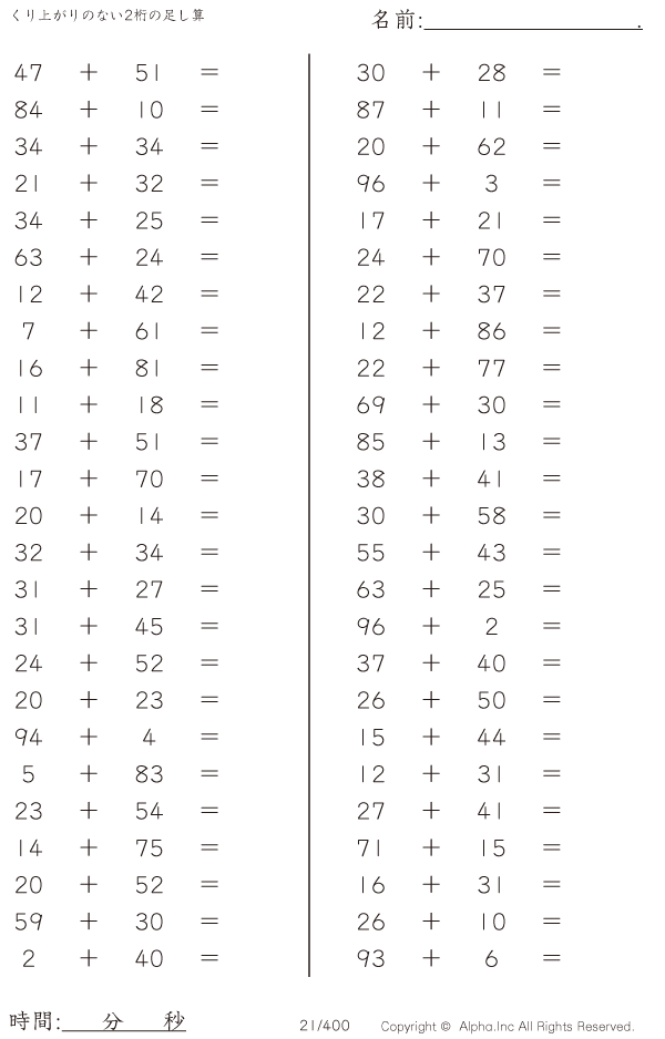 上記のボタンから「くり上がりのない2桁の足し算」の算数数学ドリル・計算ドリル(PDFプリント)がダウンロードできます。個人利用は無料です(家庭以外での配布は有料です)。