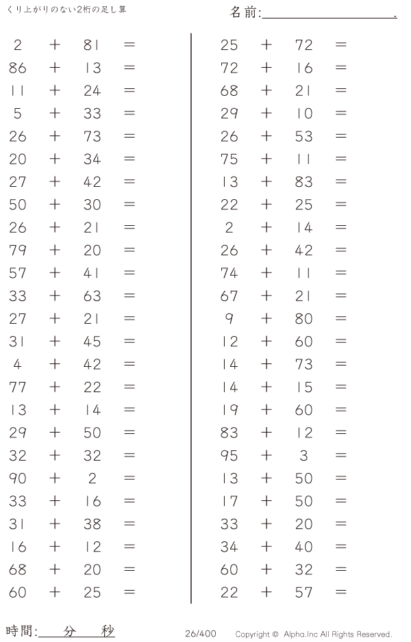上記のボタンから「くり上がりのない2桁の足し算」の算数数学ドリル・計算ドリル(PDFプリント)がダウンロードできます。個人利用は無料です(家庭以外での配布は有料です)。