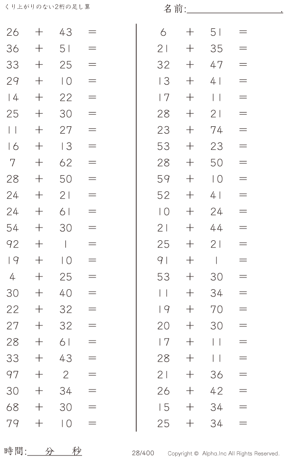 上記のボタンから「くり上がりのない2桁の足し算」の算数数学ドリル・計算ドリル(PDFプリント)がダウンロードできます。個人利用は無料です(家庭以外での配布は有料です)。