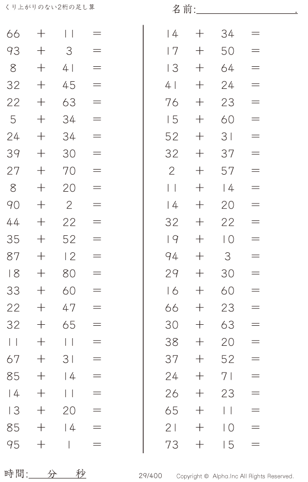 上記のボタンから「くり上がりのない2桁の足し算」の算数数学ドリル・計算ドリル(PDFプリント)がダウンロードできます。個人利用は無料です(家庭以外での配布は有料です)。