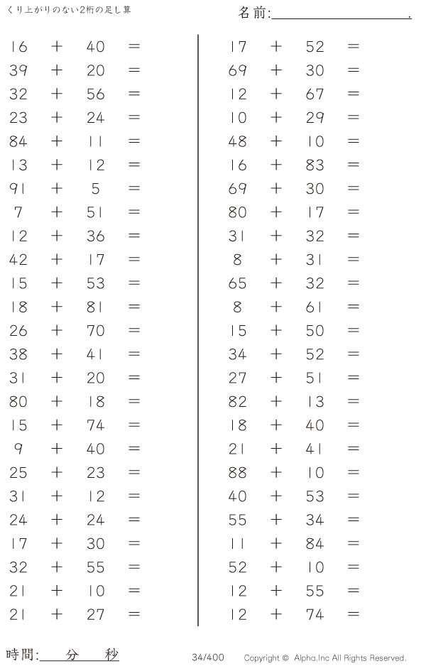 上記のボタンから「くり上がりのない2桁の足し算」の算数数学ドリル・計算ドリル(PDFプリント)がダウンロードできます。個人利用は無料です(家庭以外での配布は有料です)。