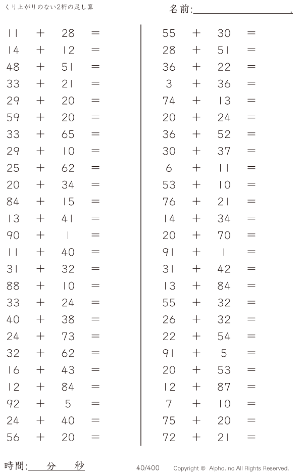 上記のボタンから「くり上がりのない2桁の足し算」の算数数学ドリル・計算ドリル(PDFプリント)がダウンロードできます。個人利用は無料です(家庭以外での配布は有料です)。