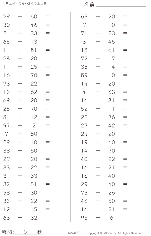 上記のボタンから「くり上がりのない2桁の足し算」の算数数学ドリル・計算ドリル(PDFプリント)がダウンロードできます。個人利用は無料です(家庭以外での配布は有料です)。